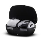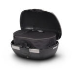 La SH45 es una maleta robusta, compuesta de polipropileno reforzado de alta calidad. El baúl resiste temperaturas extremas y protege la carga interior de impactos y caídas. Con capacidad para dos cascos integrales y un diseño de formas curvas y catadióptricos ahumados, dispone del tamaño perfecto tanto para moverse por la ciudad como para trayectos más largos, lo que le permite adaptarse tanto a scooter como a motos de media y gran cilindrada. La seguridad que proporciona el Handle Lock System permite contar con un doble cierre; por un lado, fija la maleta a la moto y, por otro lado, cierra el propio baúl. Dispone de un asa para que, una vez extraída, el transporte de la maleta sea fácil y sencillo. También dispone de tiras limitadoras internas que aseguran que no se mueva la carga interior. Como todos los Top Case de SHAD, se abre y cierra con una sola mano, sin necesidad de utilizar la llave para abrirlo. Únicamente la utilizaremos cuando queramos bloquearlo a la moto. Si eres de los que lleva el diseño un paso más allá, te gustará poder elegir entre los distintos colores de tapas, o la opción virgen para que la personalices a tu gusto. Como accesorios, disponemos del respaldo, la bolsa interna, la parrilla metálica superior y la luz de freno. El respaldo (D0RI60) proporciona un mayor confort para el pasajero además de darle un diseño totalmente único al conjunto. La bolsa interna (X0IB00), con apertura superior y bolsillo externo para una accesibilidad directa, está reforzada con una espuma interna para proteger el contenido de cualquier golpe y una cincha y asa para que sea más fácil transportarla. De esta manera la bolsa interna facilita el transporte de los enseres sin tener que extraer la maleta. Por último, la luz de freno (D0B40KL), es de leds de bajo consumo y es muy fácil de instalar, ya que se acopla en la parte inferior de la base de la maleta, incrementa la seguridad siendo la moto más visible desde una visión trasera. Al igual que el resto de maletas de moto SHAD (a excepción de TR48/TR37), incorpora la platina y el kit de tornillería.