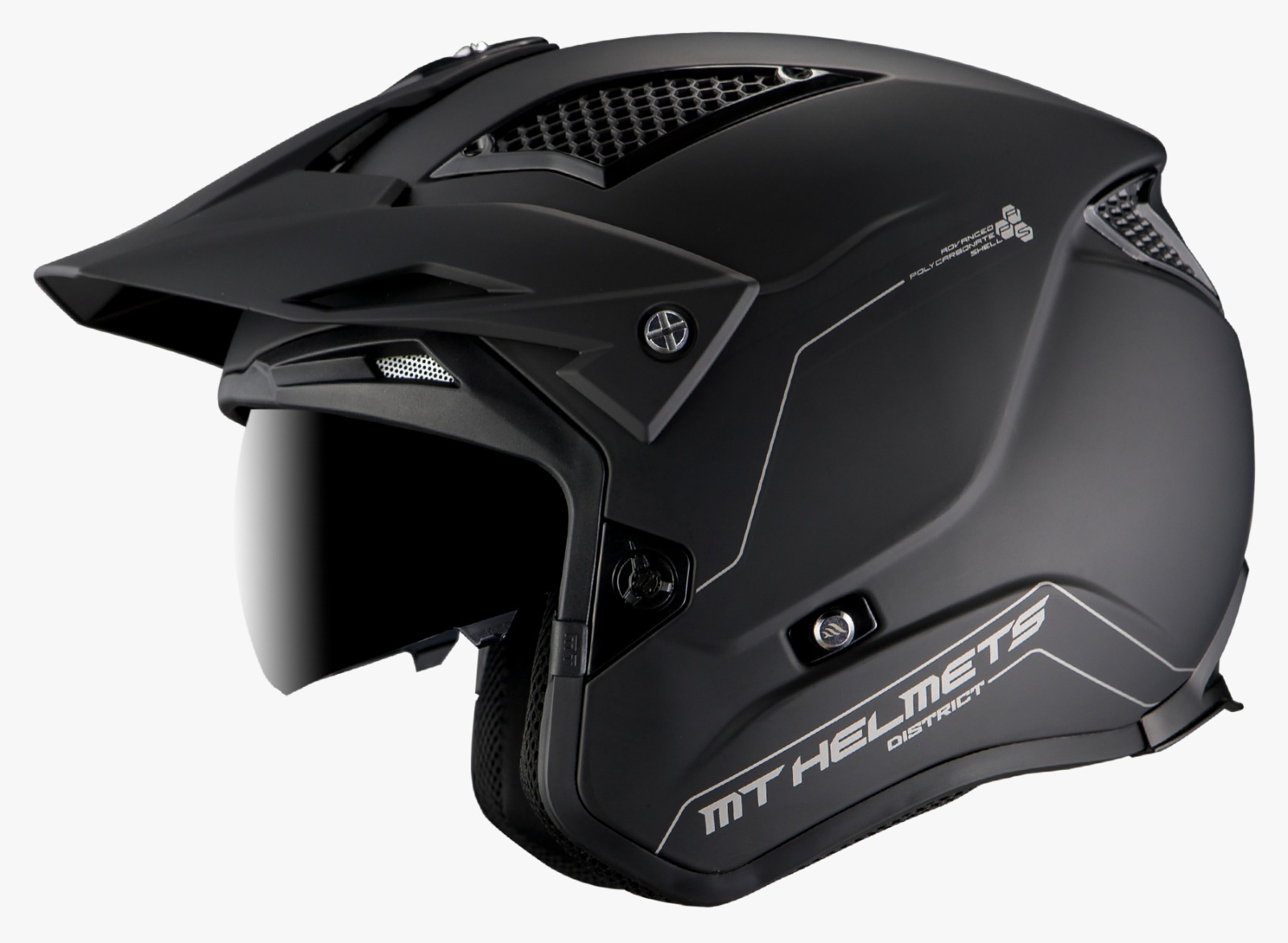El MT District SV S con homologación 22.06 es un casco jet tipo trial que resulta ideal también para uso urbano. Va equipado con un práctico visor solar con 2 posiciones, y cuenta con un sistema de ventilación con unas amplias entradas en la parte frontal y extractores en la parte trasera. Viene con un juego de tapas para las ventilaciones para bloquear el aire y la lluvia.
