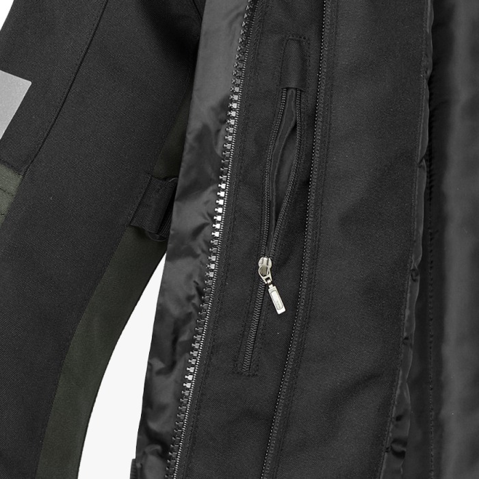 Para mayor seguridad, se puede conectar mediante cremallera con un pantal贸n y cada chaqueta tiene 2 bolsillos externos impermeables, un bolsillo interno tipo Napole贸n impermeable y un bolsillo interno impermeable. Para los que quieren la m谩xima protecci贸n posible, la chaqueta incorpora bolsillos internos en los que alojar los protectores de espalda y pecho que se venden por separado.