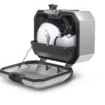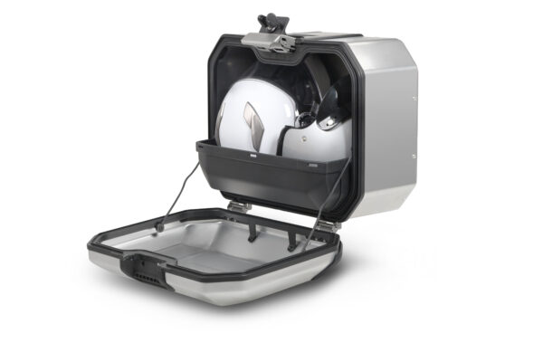 La maleta lateral TR47R está diseñada y fabricada 100% en Barcelona y tiene capacidad para un casco Trail o dos cascos (integral + jet). Cuenta con un diseño estructural aerodinámico e integrado fabricado en aleación de aluminio endurecible, un tipo de aluminio que permite un grosor reducido de 1,2 mm para obtener la máxima resistencia con un peso mínimo. Bisagras de acero inoxidable AISI 304 que permiten dejar la maleta en el suelo sin que vuelque, y protectores ABS para reforzar la maleta ante golpes.